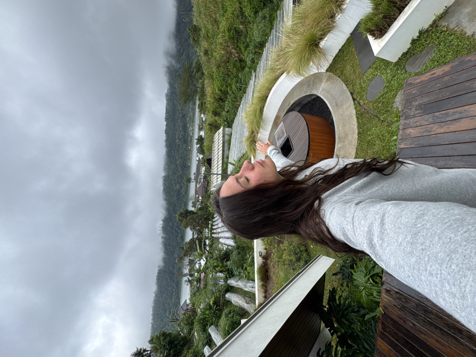 A woman in a gray sweater takes a selfie outdoors on a cloudy day. Behind her, a lush green landscape stretches towards a body of water. A circular architectural feature with a wooden interior and greenery above sits nearby. The selfie is taken from a slightly elevated perspective, showcasing the scenery behind the woman. The image is tilted slightly to the left.