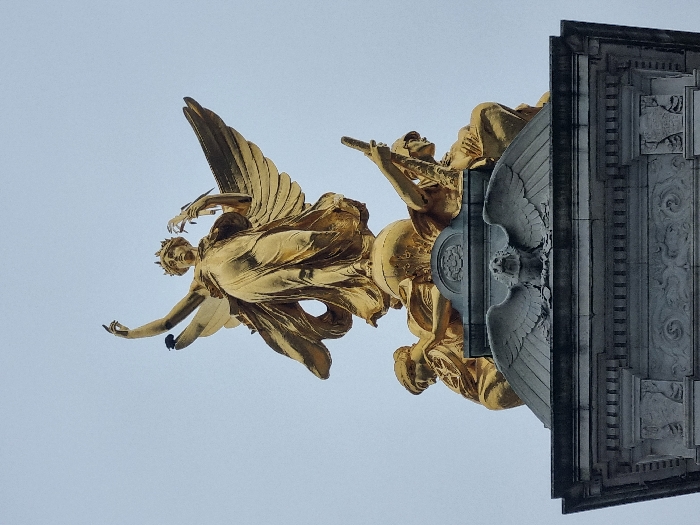 - "The image displays a detailed view of the gilded bronze statue group crowning the Victoria Memorial, located directly in front of Buckingham Palace, City of Westminster, London, United Kingdom" by FM-YTYDR2, licensed under CC BY 4.0
