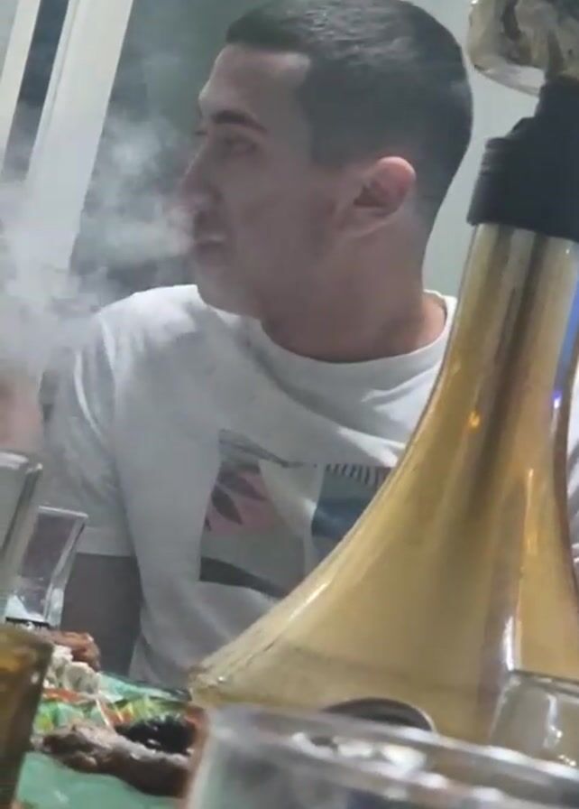 A medium shot shows two men sitting at a table. The man in focus wears a white t-shirt and has short dark hair. He exhales a cloud of smoke. Behind him, another man with a shaved head and a black tank top leans in to talk to him. A large gold hookah sits on the table, partially obscuring the view. The table is covered with food and drinks. The scene appears to be indoors.