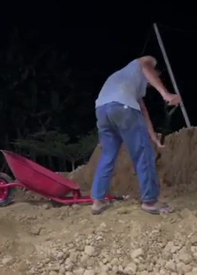 man shoveling dirt into a red wheelbarrow at night. He is wearing a light-colored tank top, blue jeans, and flip-flops. He stands on a dirt pile and uses a shovel to scoop up dirt and toss it into the wheelbarrow, which is parked at the base of the pile. The scene is lit by artificial light in an otherwise dark environment. There are trees visible in the background and a white structure that could be a pole or a building frame.