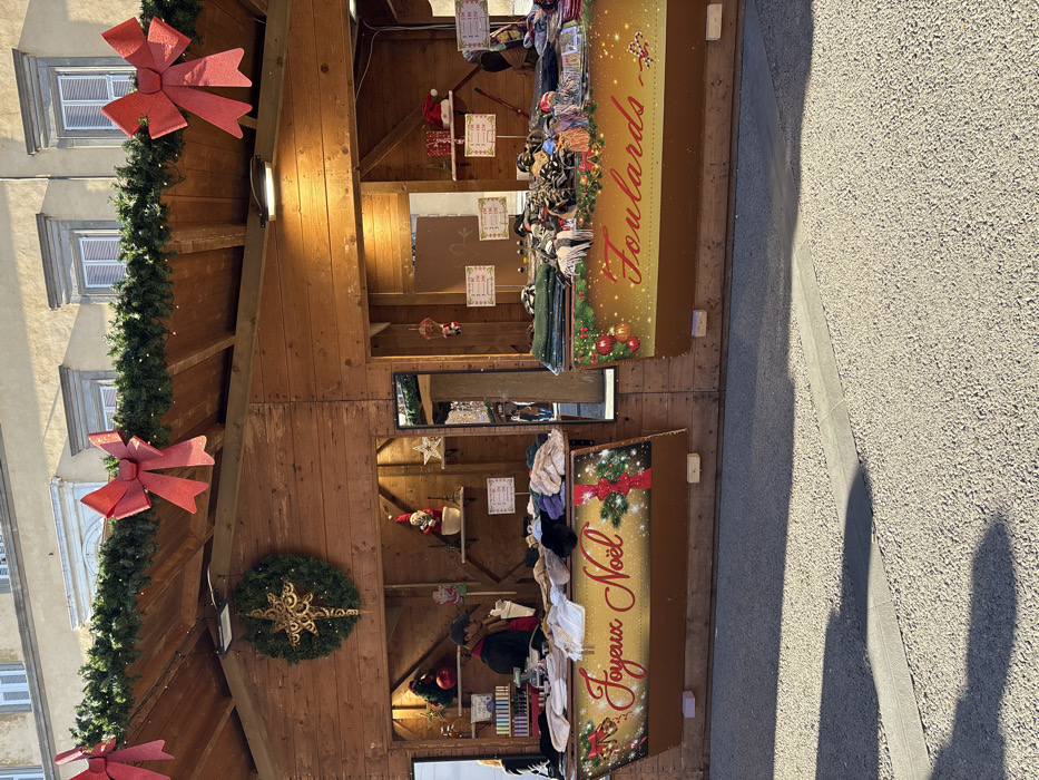 A detailed view of a festive outdoor market stall, likely part of a Christmas market, located in a city, specifically identified as Lucca, Italy. The wooden stall structure features two adjacent sections, each with an open counter display and an overhead roof. The roofline is adorned with evergreen garlands, small lights, and multiple large, glittery red bows. A prominent Christmas wreath with a large golden star is centered on the upper left section of the stall. The left stall counter displays folded textiles, including sweaters and scarves, under a panel decorated with "Joyeux Noël" in red script against a golden, sparkling background with a red ribbon and ornaments. Behind this counter, a partially visible individual, wearing a dark jacket and a red scarf, attends to items on shelves displaying small bottles, decorative figurines, and price tags. A tall mirror reflects the stall's interior and a blurred view of an area beyond. The right stall counter exhibits numerous folded "Foulards" (scarves) in various patterns and colors, situated below a panel with "Foulards" in red script against a similar festive golden background with red ornaments. Behind this counter, shelves hold wrapped gifts, a small Christmas tree, a red Santa hat, and additional price tags. The ground in the foreground is a light-colored, textured pavement with distinct, elongated shadows stretching from the left, indicating direct sunlight. In the background, above the stall's roof, a light-colored stucco building with multiple windows, framed by decorative sills and equipped with light-colored shutters, is visible under a clear sky. The scene is bright, suggesting daytime conditions.