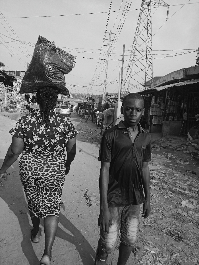 A black and white photo shows a woman carrying a large bag on her head, walking away from the viewer on a dirt road. A young man with a serious expression stands to her right, closer to the camera. Shops line the right side of the road, and utility poles and power lines stretch overhead. The scene appears to be in a developing country, with a mix of poverty and everyday life visible.