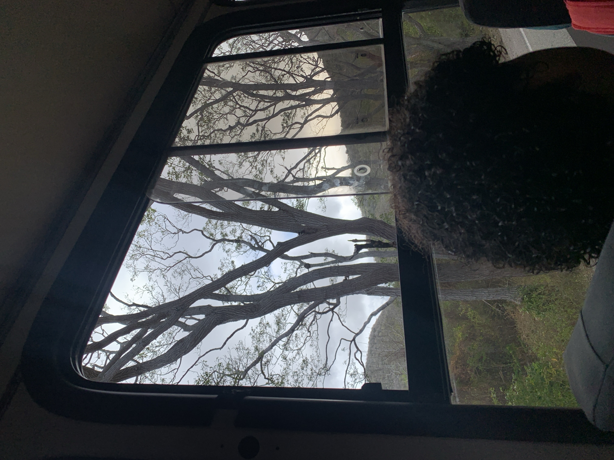 view from inside a vehicle, likely a bus, looking out the window. Visible through the window are large, sprawling tree branches against a cloudy sky. To the right of the window frame is a person with dark, curly hair, positioned with their head near the window. The environment outside the window includes foliage and what appears to be a glimpse of a road. The location is Tacarigua, Venezuela.