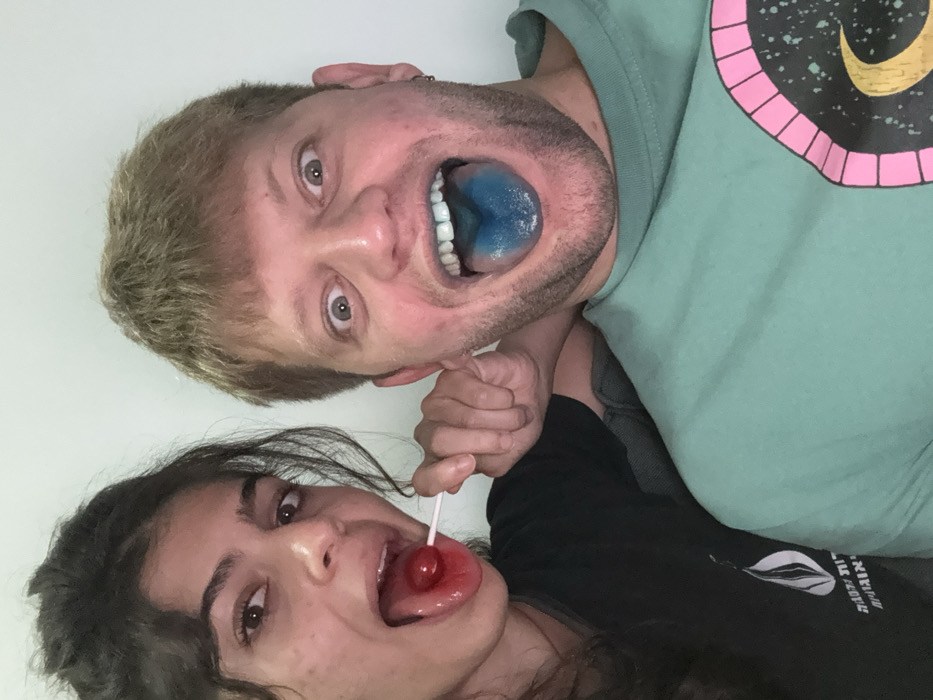 A close-up selfie shows two individuals, one female and one male, indoors against a plain light-colored wall in Tel Aviv, Israel. The female, positioned on the left, has dark, curly hair pulled back and wears a dark t-shirt with a white graphic featuring Hebrew text, partially visible as "רות ונווה" (Rut & Nave). She holds a red, spherical lollipop on a white stick, which rests on her extended, red-stained tongue. Her right hand is seen resting on the male's left shoulder. The male, on the right, has short, light-brown hair and a small dark earring in his left ear. He wears a light teal t-shirt with a dark graphic bordered in pink. His mouth is open, revealing an extended tongue dyed bright blue, forming a distinct V-shape near the tip. Both individuals look directly at the camera with wide eyes and open mouths, displaying a playful expression.