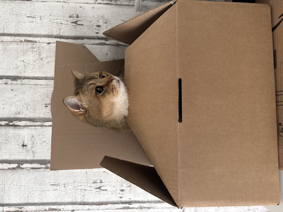 A domestic cat is observed in an indoor environment in l'Hospitalet de Llobregat, Spain. The cat, possessing short, golden-brown fur with lighter tones on its chin and chest, and green eyes, is partially visible. Its head and upper torso protrude from the open top of a brown cardboard box. The animal is facing to the right side of the frame, with its gaze directed slightly downward. The cardboard box features a horizontal slot on its front-facing panel and rests on an additional, larger brown cardboard surface visible at the bottom of the frame. The background consists of a wall covered in a distressed, vertical plank pattern in white and light grey tones.