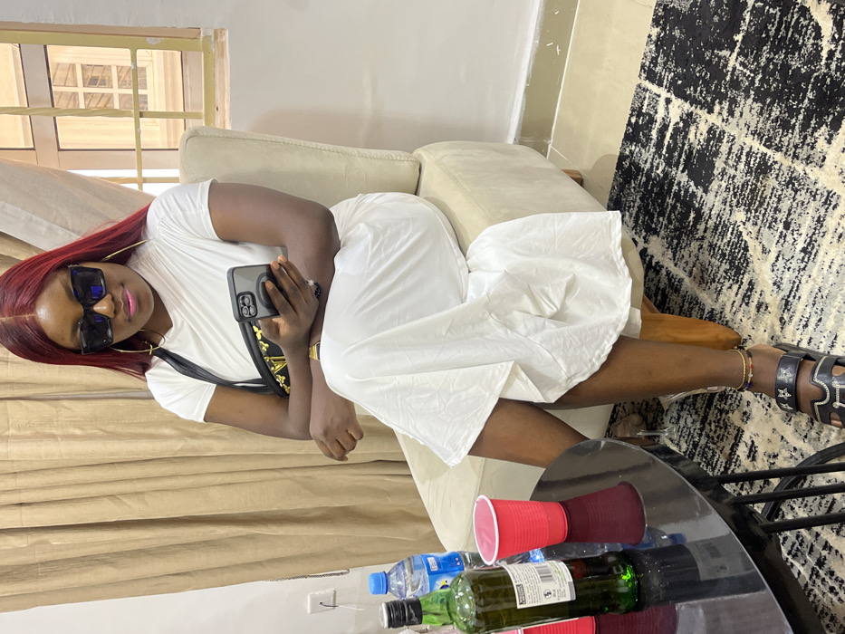 A dark-skinned woman with straight, red hair and dark sunglasses is seated on a light beige upholstered armchair in an indoor setting in Gwarinpa, Nigeria