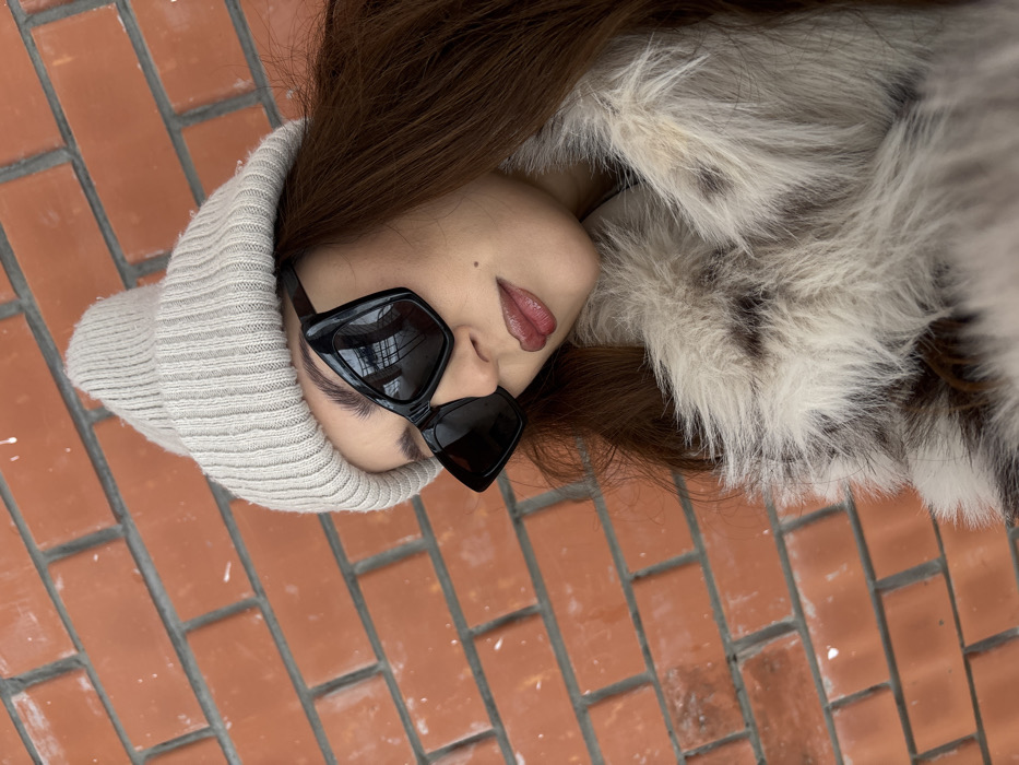 A close-up portrait, taken in Kazan, Russia, depicts an individual against a reddish-orange brick wall. The subject, presumed female, is positioned with a slight tilt. They wear a light beige knitted beanie hat and large, black, angular sunglasses. Long, reddish-brown hair is visible from under the beanie. The lower face shows plump lips coated with a glossy, pinkish-mauve lipstick, and a small mole is present on the upper lip/cheek area. A fur garment, predominantly light beige/white with sporadic darker brown/black patches, is visible around the neck and shoulders. The brick wall in the background exhibits several small white splatters or flecks.
