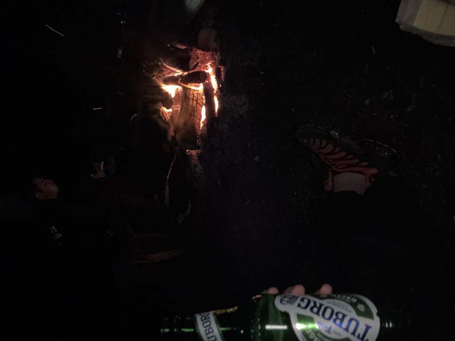 A nocturnal scene in Pancharevo, Bulgaria depicts two individuals gathered around a campfire on dark, uneven ground. In the immediate foreground, a person's hand holds a green glass bottle displaying "TUBORG" branding, while their left foot, encased in a dark shoe with distinctive red wave-like patterns, rests on the ground. To the left of the centrally positioned, actively burning campfire, another individual is seated or crouched, partially illuminated by the flames. This person wears dark clothing, and their profile is visible, suggesting they are observing the fire or an object in their hands. The campfire, composed of multiple logs, emits bright orange and yellow flames, providing the primary light source, with faint sparks visible ascending into the dark background. A dark, possibly wooden structure is partially discernible behind the seated person.