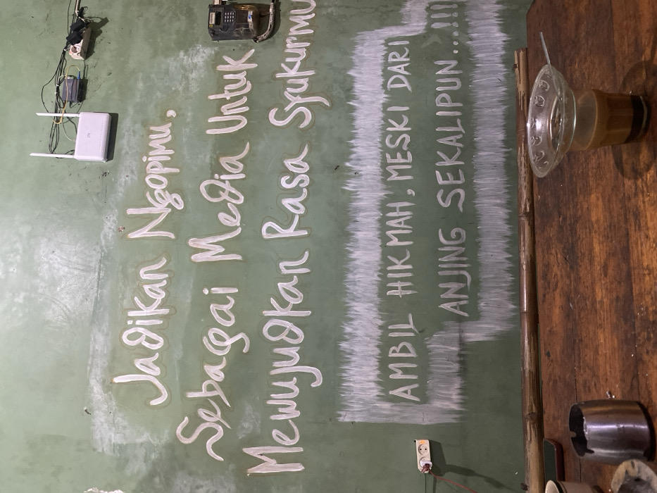 The scene depicts an interior view of a humble establishment in Kecamatan Pati, Indonesia, focusing on a distressed light green wall and a wooden table