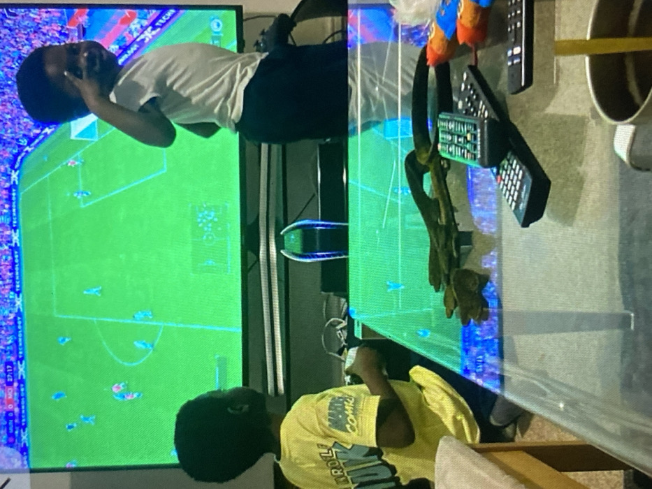 Two children are engrossed in a video game displayed on a dual-screen setup. One child, wearing a white shirt, is seated on the upper half of the image, while the other, in a yellow shirt, sits below. Both appear focused on the game, which features a green soccer field. The background includes a wall with decorative items, such as wooden accents, multiple remote controls, and other indiscernible objects, adding depth to the setting.