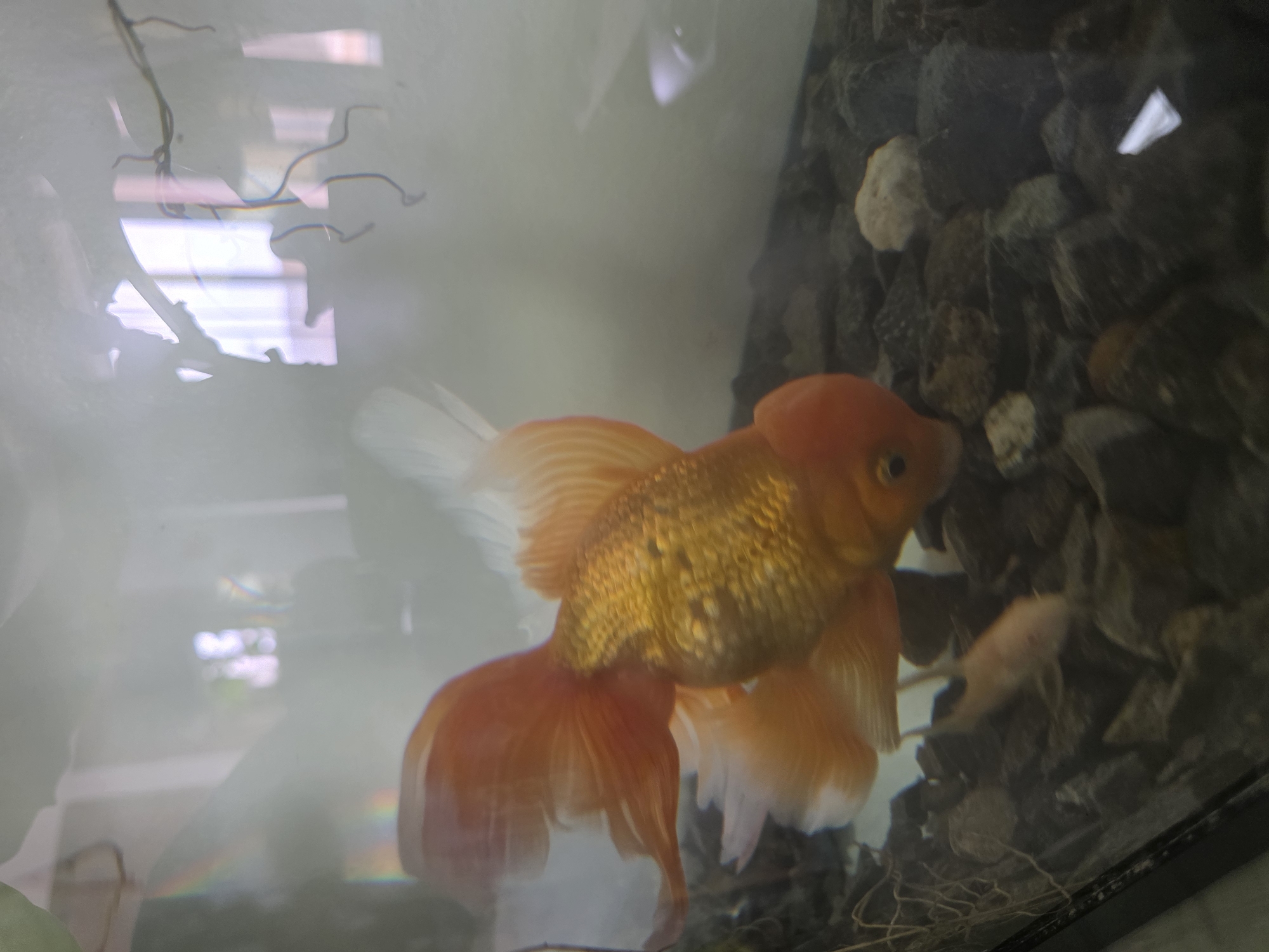 A goldfish with orange and white fins swims in an aquarium filled with water and rocks