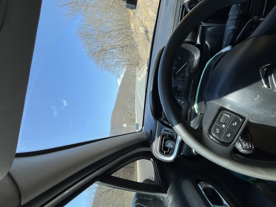 The image presents a forward-facing view from inside a vehicle, likely a Citroën, traveling on an asphalt road in a rural, hilly area. The location is specified as Shivarovo, Bulgaria. The interior of the vehicle occupies the lower half of the frame, showcasing the top portion of a dark-colored steering wheel with integrated control buttons on its left spoke. Behind the steering wheel, the instrument cluster is partially visible, displaying the number "56," presumed to be the vehicle's speed, along with several illuminated indicator lights. An air vent on the far left of the dashboard features a circular air freshener attached. Minor reflections are present on the windshield and dashboard. The exterior view, visible through the windshield, shows a two-lane asphalt road curving to the right in the mid-distance. A metal guardrail runs along the right edge of the road. On the left side of the road, a circular white road sign with a red border is visible. The surrounding landscape consists of rolling hills covered with bare deciduous trees, indicating a season devoid of full foliage, possibly late winter or early spring. A distant, lighter-colored peak or patch is discernible on the horizon to the right of the road. The sky above is clear and blue. No individuals are present in the observable scene.