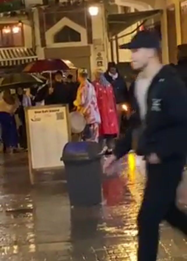 wet, cobblestone street scene in what appears to be a European city at night. People are walking around, many with umbrellas, suggesting it is raining. There are buildings with illuminated windows and awnings visible in the background. In the center of the frame, a man in a colorful outfit is playing a drum. A cafe menu board stands nearby. Some people appear to be dressed in traditional clothing.