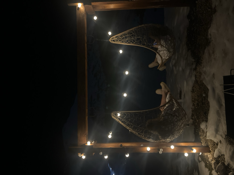 This image depicts an outdoor night scene in Virak, Montenegro, characterized by a snowy ground cover and artificial illumination. Two individuals are seated in separate, woven, tear-drop shaped hanging chairs suspended from a wooden frame. The frame consists of two upright posts and a horizontal beam. String lights with spherical bulbs are strung along the left post and beneath the horizontal beam, emitting light that illuminates the immediate area and creates lens flares. The ground is predominantly covered in snow, with darker patches of exposed gravel or soil beneath and around the chairs. In the background, dark, snow-covered mountains are faintly visible against the dark night sky. A dim light source is also visible further in the distance to the left, likely from another structure or light fixture. Both individuals in the chairs are oriented with their backs to the viewer. The person in the left chair has long, light-colored hair and appears to be wearing light-colored leg coverings and footwear. The person in the right chair is similarly clad in light-colored leg coverings and footwear and is holding a small, illuminated electronic device in their hands. A dark, low-lying object, possibly a table, with two thin white objects resting on its surface, is partially visible at the bottom center of the frame.