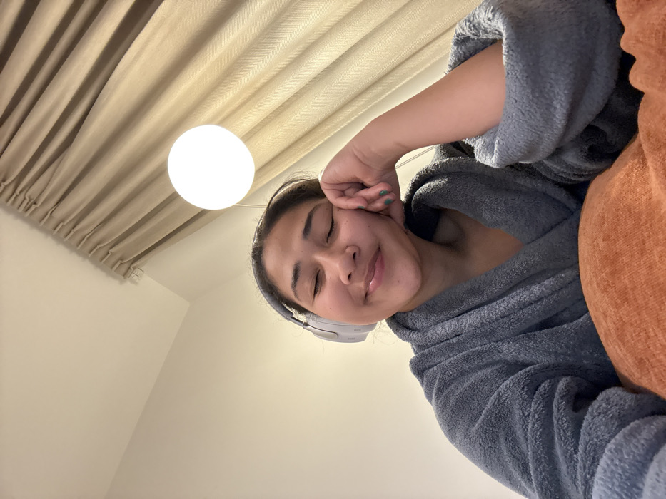 A low-angle shot captures a person in a gray bathrobe and headphones. They are reclining against an orange surface, their eyes are closed. One hand is near their ear, resting on the side of their face. Above, beige curtains hang, partially obscuring a round, bright light fixture. The wall in the background is a soft, off-white color.