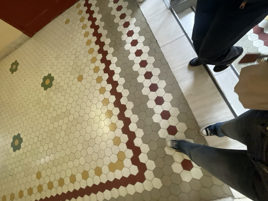 - "The image depicts an indoor scene from an elevated, downward-facing perspective, primarily focusing on a patterned tiled floor and the lower extremities of two individuals" by FM-BmcI33, licensed under CC BY 4.0