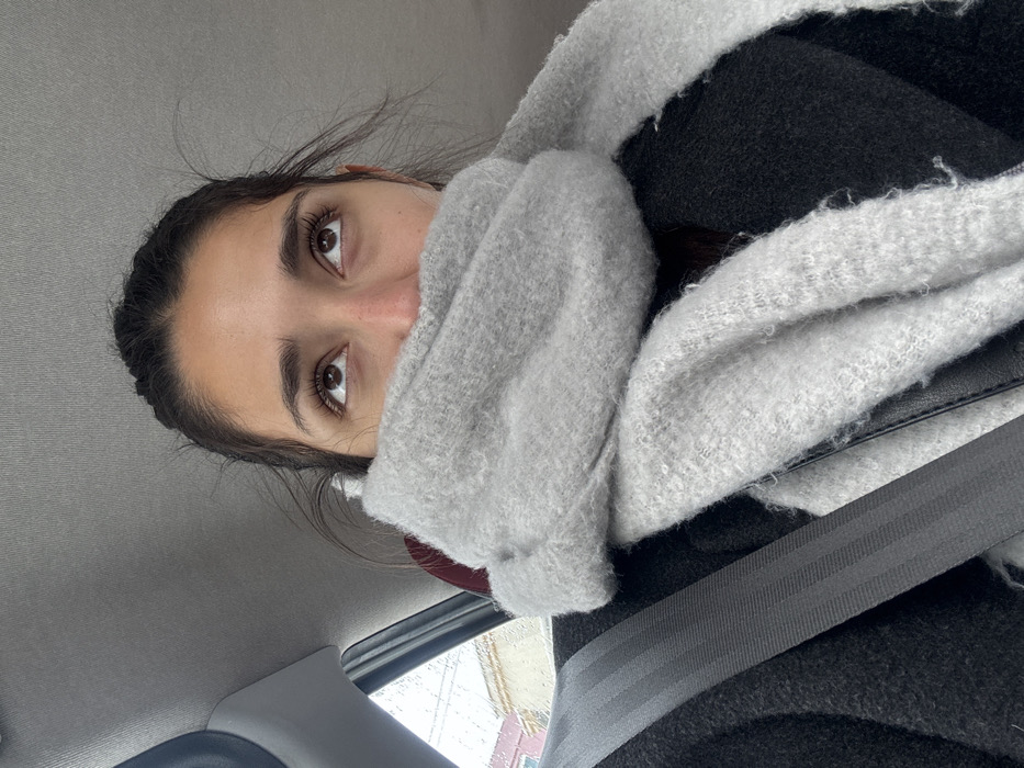 The image presents a close-up portrait of a female individual from the mid-chest upwards, seated inside a vehicle. She wears a dark coat and a thick, light grey, possibly knitted scarf that covers her lower face from below the nose. Her dark hair is pulled back, and her light brown eyes are directed upwards. A grey seatbelt is diagonally positioned across her chest and left shoulder. The vehicle's interior includes a light grey headliner. Through the vehicle's side window on the left, raindrops are visible on the glass, indicating precipitation. The blurred exterior background shows a light-colored building facade, suggesting an urban or suburban setting. No specific location within Kraljevo, Serbia, is discernible from the visual evidence in the image.