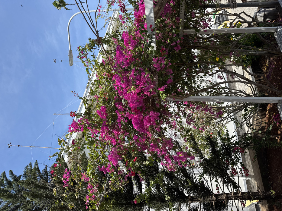 A vibrant bougainvillea bursts with fuchsia blooms, cascading over a white pergola