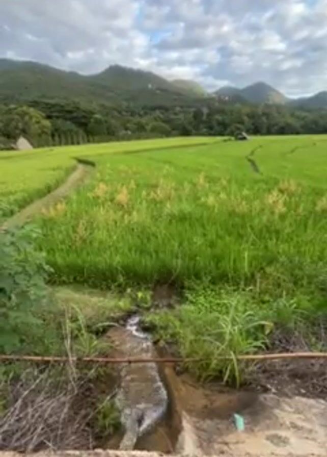 The scene is a tranquil rural landscape featuring a verdant rice field extending towards the horizon, set against the backdrop of hills and a cloudy sky. In the foreground, a small stream flows under a low concrete structure, bisected by exposed pipes. The rice field is predominantly green with patches of yellowing rice plants. The hills are covered in lush trees. The clouds in the sky are scattered, allowing glimpses of blue. The overall impression is one of natural beauty and agricultural activity.