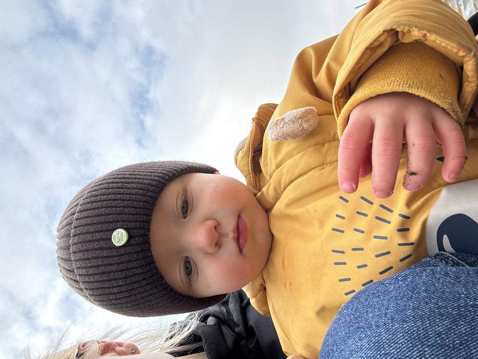 A close-up, upward-angled photograph captures a young child seated on an adult's lap in an outdoor setting in Voskresensk, Russia. The child, with fair skin and light-colored eyes, is wearing a dark brown ribbed knit beanie with a green circular pin displaying "Anglers Point Premium," and a mustard yellow jacket that features a dark blue stylized animal face design and light brown faux-fur ears. The child's left hand is visible, holding a small red object, possibly a berry, and shows dirt on the fingertips. A portion of an adult is visible in the upper left, characterized by fair skin, blonde hair, an earring, a black jacket, and blue denim trousers. The background consists of an overcast sky with scattered white clouds.