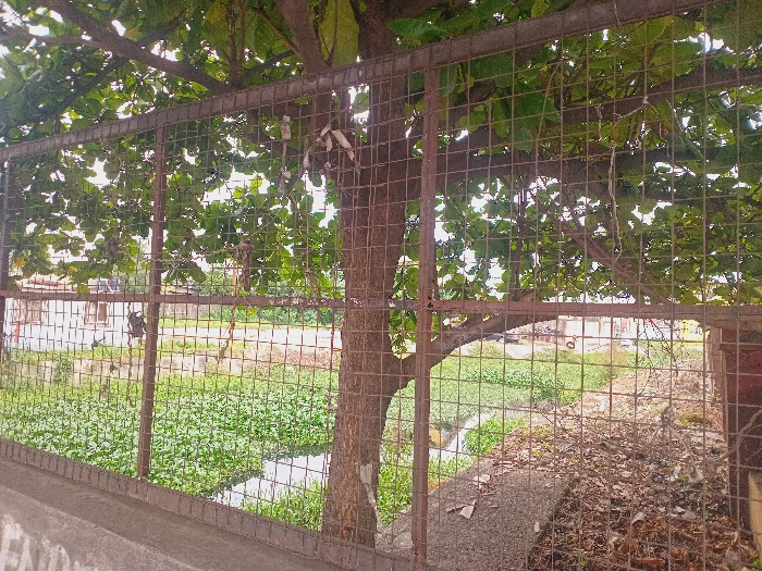 This image depicts an outdoor urban scene in Iganmu, Nigeria. A rusty, brown metal grid fence occupies the foreground, extending horizontally across the frame and partially obscured at its base by a concrete ledge. A large tree with a prominent brown trunk and dense green foliage is centered behind the fence, with branches extending throughout the upper section. To the left of the tree and behind the fence, a canal or ditch is heavily covered with green aquatic vegetation, possibly water hyacinth, with a small, irregular patch of open water visible towards the lower center. Further left, a light-colored building featuring visible windows and dark architectural elements is present in the mid-distance. To the right of the tree, an area of dry ground is covered with fallen brown leaves and assorted debris. The background features indistinct structures or vehicles under a bright, diffused sky. No individuals are present.