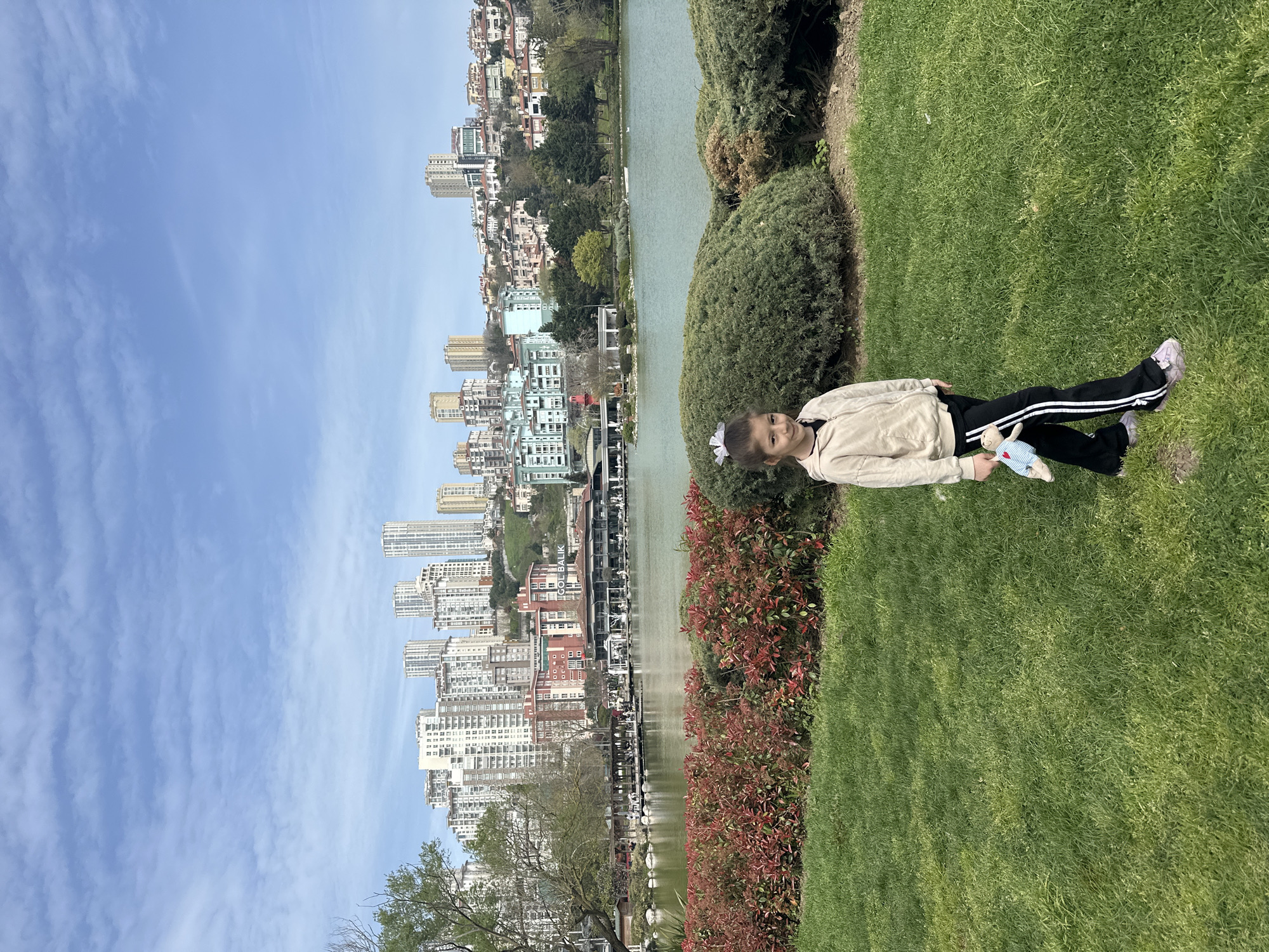A young girl is lying on a grassy hill. She is wearing a beige jacket, black pants with white stripes, and sneakers. She is holding a stuffed animal. Behind the hill is a lake and a city skyline. The location is Başakşehir, Turkey. The sky is blue with some clouds.