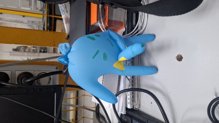 - "The scene depicts a light blue inflated disposable glove, modified to resemble a humanoid figure, standing upright on a light grey workbench surface in Stryama, Bulgaria" by FM-RAwW93, licensed under CC BY 4.0