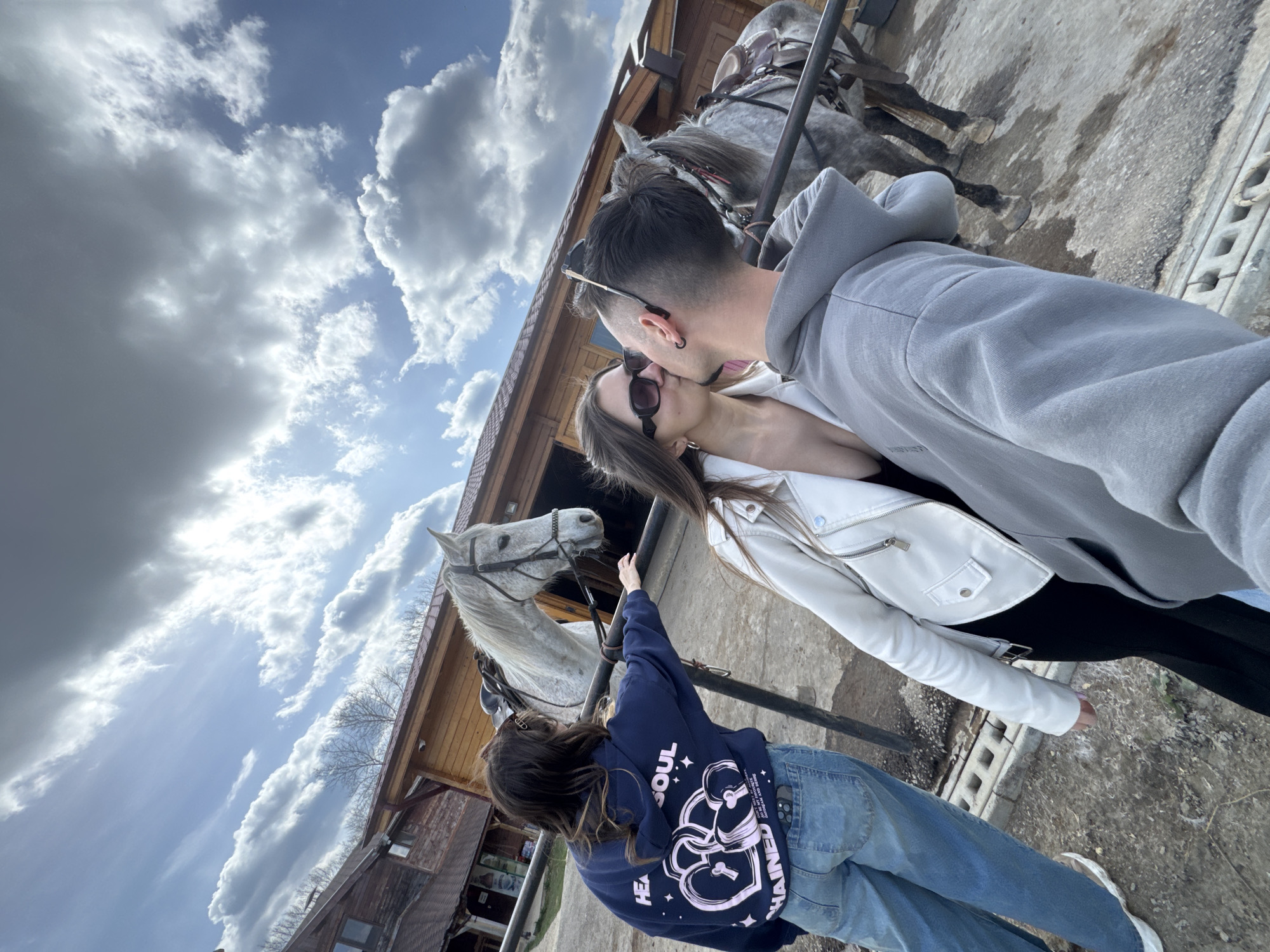 The image captures a scene at a horse stable in Kovachevtsi, Bulgaria. A couple is kissing, with the male wearing a grey hoodie and sunglasses perched on his head, while the female is in a white leather jacket and sunglasses. In the background, another person in a blue sweatshirt with a graphic design and jeans is reaching towards a grey horse standing at a wooden fence. Other horses are visible further back. The sky is partly cloudy. A wooden building, likely part of the stable, is also visible.