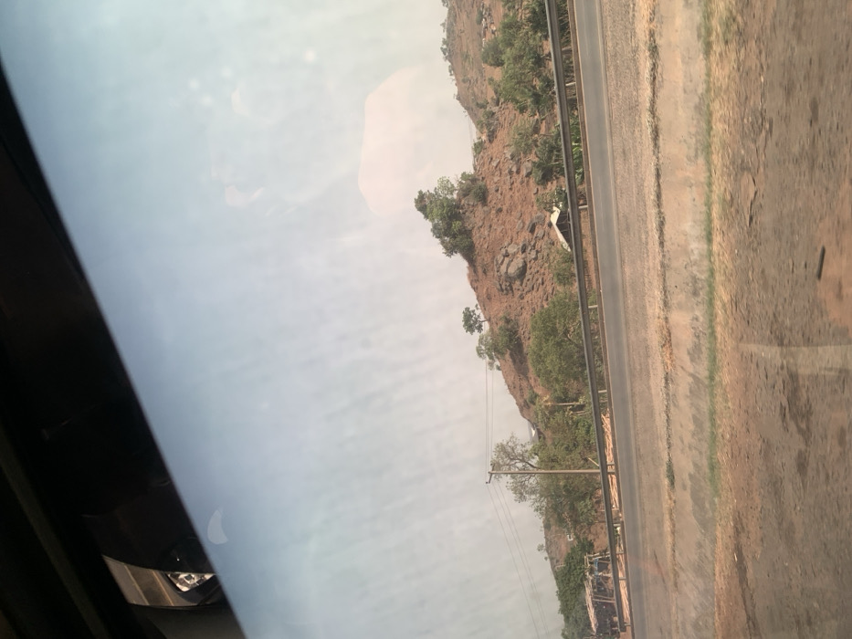 The image depicts a static landscape view from inside a vehicle in Kugbo, Nigeria