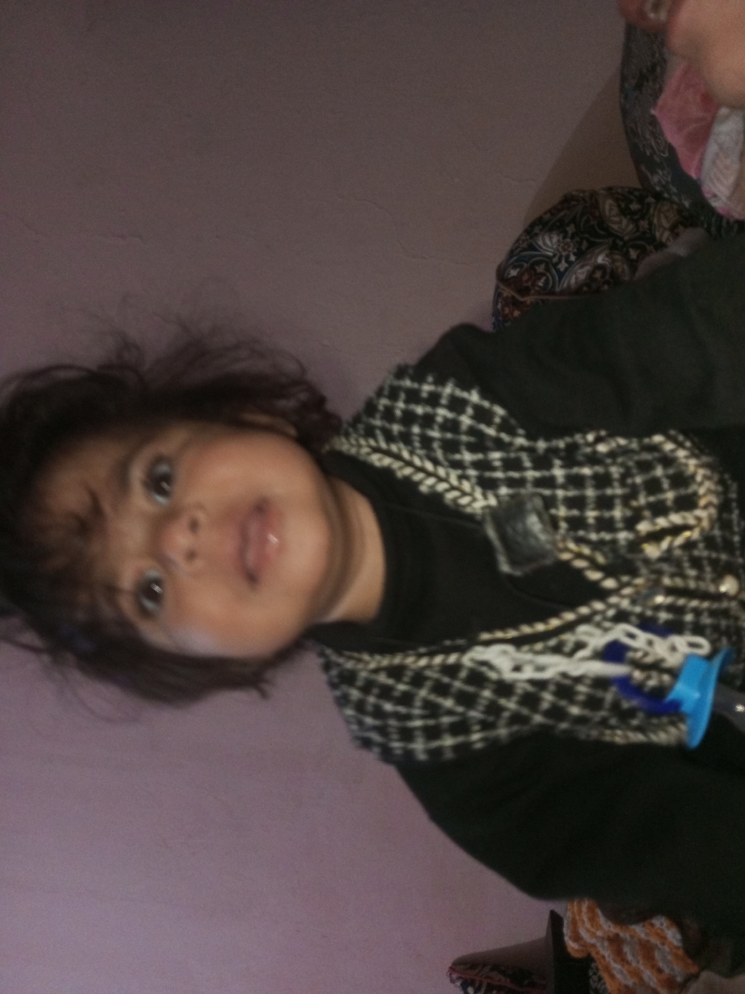 This image depicts a young child, appearing to be an infant or toddler, situated indoors in Mansehra, Pakistan. The child has dark hair, a light complexion, and dark eyes, looking upwards with a slightly open mouth. They are dressed in a black long-sleeved garment, layered with a black and white checkered vest or sweater. A white cord and a blue, clip-like object are visible across the child's chest area. The background immediately behind the child is a plain, light purplish-brown wall. To the upper right of the child's position, a dark fabric with a paisley or floral pattern in blue, black, and red hues is visible, likely a pillow or blanket. In the lower right portion of the frame, a distinct orange and white patterned fabric is present. The scene is illuminated by ambient indoor lighting.