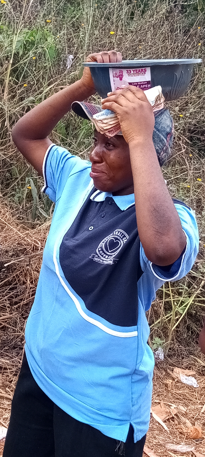 In Ejule, Nigeria, a dark-skinned adult female is photographed outdoors, visible from the chest up. She wears a light blue and dark blue polo shirt with a white dividing stripe; the dark blue section displays a white emblem including a heart icon and partial text such as "MARSHALL GR," "OFFEJ," and "MOTTO: PRE." Black trousers are partially visible. She balances a dark grey plastic basin on her head, with folded Nigerian Naira banknotes tucked beneath it. Her left hand supports the money and the basin, while her right hand touches her forehead near the basin, assisting with stabilization. A rectangular flyer, affixed to the basin, shows text including "33 YEARS," "LATE MALLAM," and "APEH," along with an illustration of a person. The background consists of dense, dry, brownish-green vegetation, including tall grasses and weeds, with scattered small yellow flowers and visible white litter on the ground.
