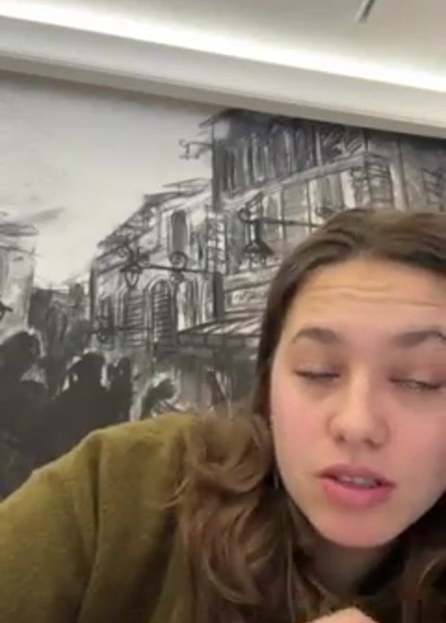 A woman with long brown hair, wearing a green sweater and a ring on her finger is talking and looking at the camera. She rests her head on her hand. A black and white sketch of a city street scene hangs on the wall behind her. A white light fixture can be seen at the top of the frame.