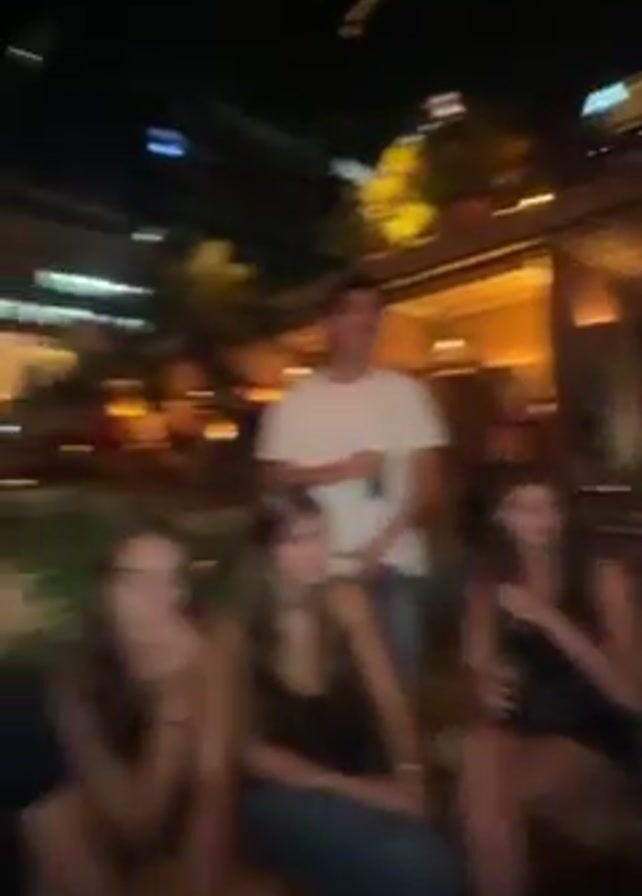 The video captures a night scene with a group of people gathered near a swimming pool. Several individuals are visible, including a man in a white t-shirt standing among others, a woman in a black outfit seated with a drink, and a person with curly hair facing away from the camera. The pool is green and reflects the ambient light. Palm trees and building outlines punctuate the skyline in the background. The setting suggests an outdoor social event at a bar or poolside lounge at night.