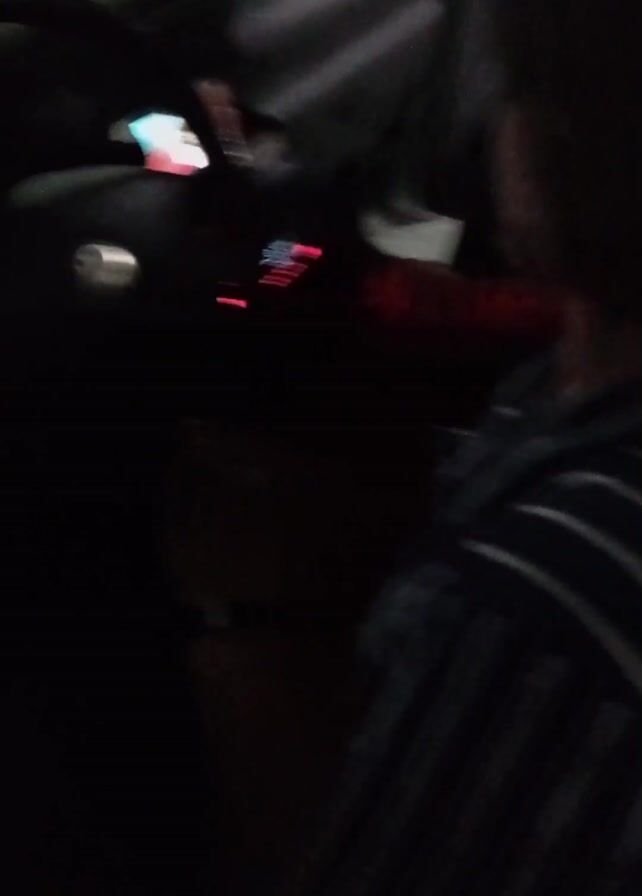 interior of a car at night. A person in a striped shirt sits in the driver's seat with the steering wheel and dashboard in view. There is a passenger to the right of the driver. Loud music is playing.