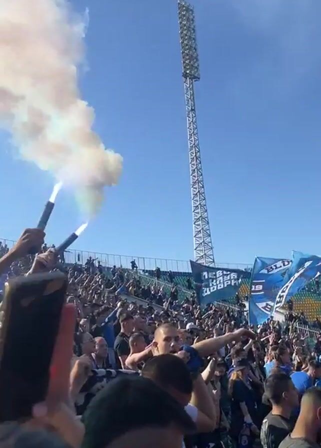 crowded stadium during a sports game. People are in the stands, some holding flags and flares. There is a running track between the stands and the field. Security personnel can be seen on the track. Flares of various colors, including blue, orange, and black, are being lit, creating smoke. The sky is blue with some clouds.