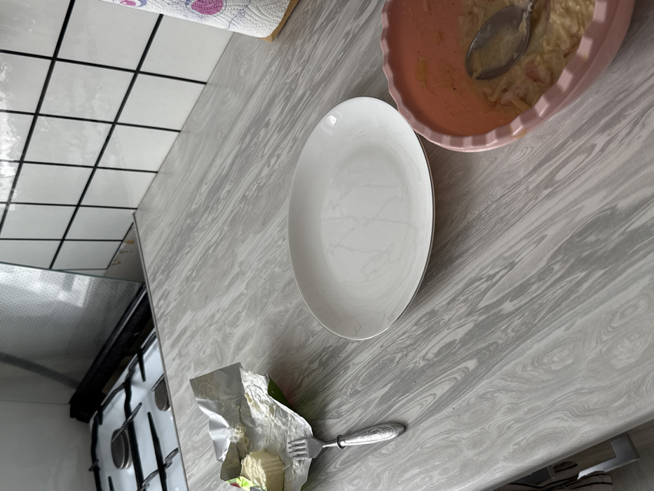 The image depicts a kitchen interior. The specific location within Chaikovsky, Russia, is not discernible from the visual information provided. The scene is captured from an eye-level perspective, looking down at a light-grey countertop with a swirled, marbled pattern. On the left side of the countertop, a piece of light-yellow butter or cheese, partially unwrapped from a silver foil package with green accents, is visible. A silver-colored fork with an ornate handle rests within the open foil wrapper, adjacent to the substance. To the right of the fork, an empty, clean, white oval plate with a subtle grey marbling pattern and a thin silver rim lies flat on the countertop. Further to the right, a pink, scalloped bowl contains a creamy, light-colored food mixture, possibly pasta or a casserole, with a silver spoon resting inside it. In the background, a white tiled backsplash with dark grout lines is visible, extending above the countertop. A silver gas stovetop with four black burners is positioned to the left of the backsplash, partially obscured by a clear, reflective glass splash guard. A white paper towel roll on a wooden holder is partially visible on the far right, near the backsplash. The overall lighting suggests an indoor setting, possibly with natural light from a window reflected in the splash guard. No people are present in the scene.