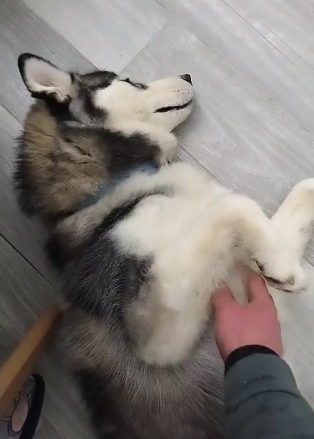 - "A person is petting a Husky dog lying on its back on a light-colored wooden floor" by FM-M4lpO2, licensed under CC BY 4.0