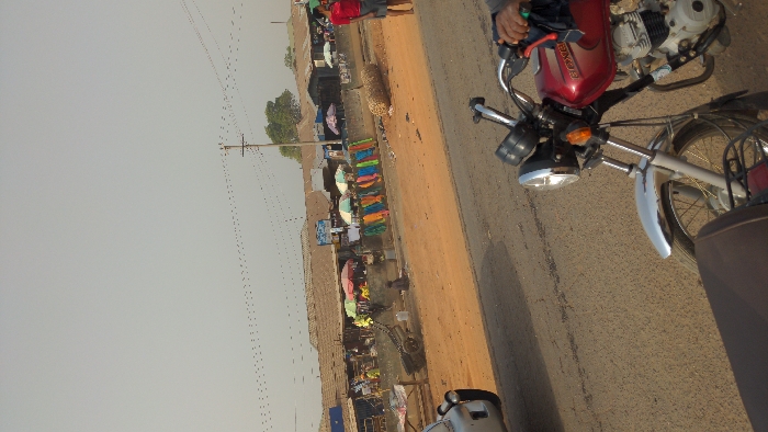 The image depicts a bustling roadside market scene in Ado, Nigeria, observed from a low angle
