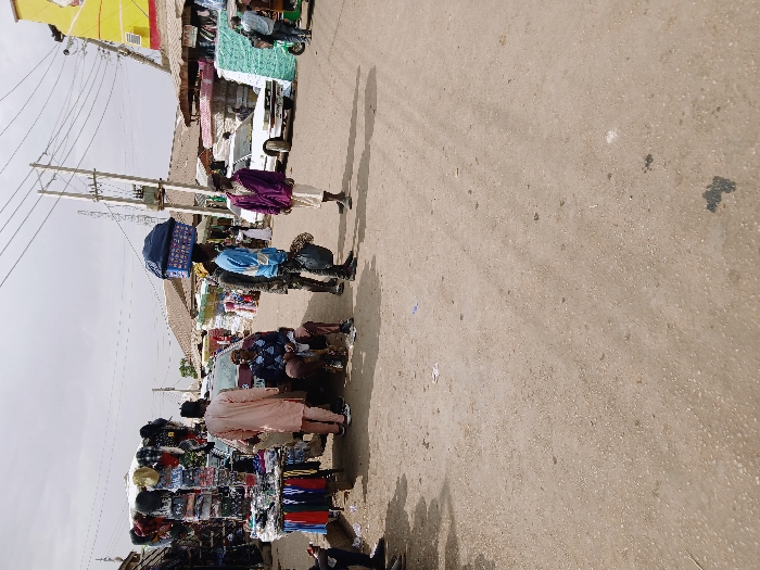 The image captures a bustling outdoor market street in Masvingo, Zimbabwe, under an overcast sky. The road surface is unpaved, consisting of dirt and gravel with visible wear and scattered debris. On the left, a street vendor's stall displays various clothing items, including caps, shirts, and trousers, on racks and a table. A light-colored sedan is parked immediately behind this stall. A person wearing a light-colored traditional garment stands next to the sedan, facing away from the camera. Another individual is seated on a low stool or object near the car, wearing a patterned shirt and dark trousers. In the central roadway, two individuals stand. One person, wearing a blue long-sleeved shirt and dark trousers, carries a large blue basket or container balanced on their head and a dark bag in their left hand. The other individual, wearing a purple jacket over lighter clothing and light trousers, holds a dark object in their left hand. To the right, further down the street, a white sedan is parked. Beyond this vehicle, additional market stalls are visible, displaying stacks of what appear to be mattresses or large cushions, some covered in green material. A partial view of a yellow and red building facade is seen in the upper right background. Overhead power lines are strung across utility poles on the right side of the street. In the far right background, a person is positioned near a three-wheeled vehicle. The scene depicts active commercial exchange and movement within a busy urban environment.
