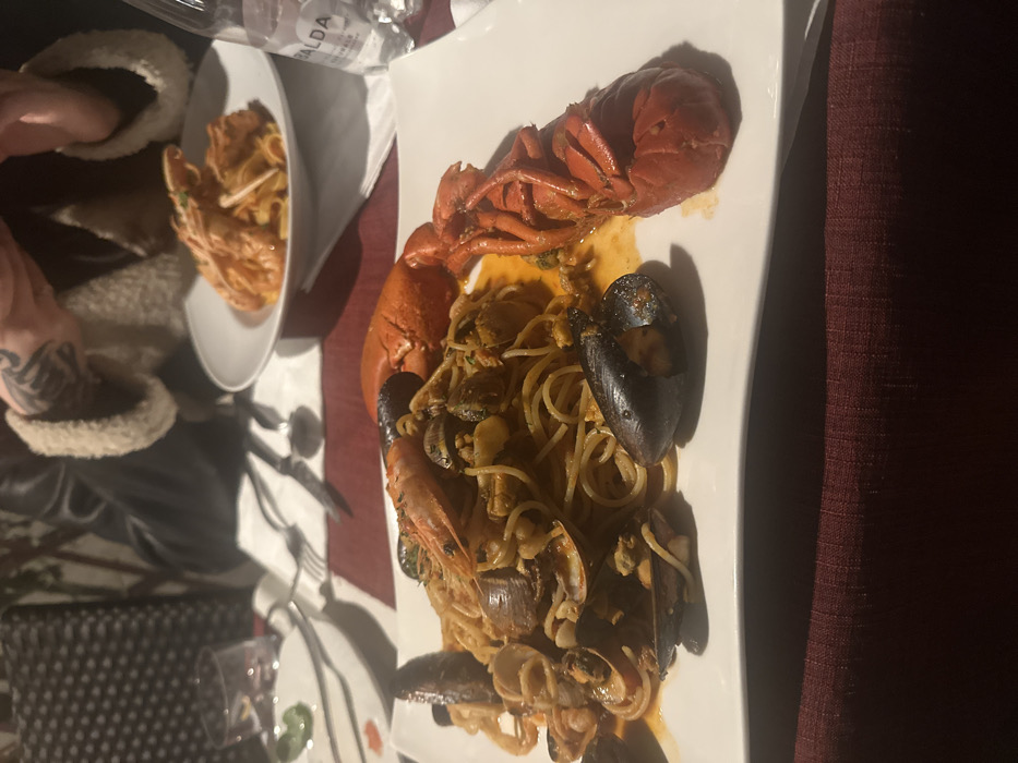 An indoor dining scene in a restaurant in Venice, Italy, is depicted from a slightly elevated perspective. In the immediate foreground, a white rectangular plate holds a substantial serving of spaghetti al frutti di mare, featuring spaghetti coated in an orange-red sauce. Prominently displayed on the plate are a whole cooked lobster, split lengthwise with the tail intact on the right side and part of the head/body on the left, numerous black-shelled mussels, various clams, and at least one large cooked shrimp positioned centrally. The table beneath is covered with a dark red or maroon tablecloth. In the midground, a second individual is seated opposite, their upper torso, arms, and hands visible. This person wears a dark jacket with a light, textured collar or trim. A dark, intricate tattoo is visible on their left forearm. Their hands are clasped. Behind the main plate, on the same table, is a second white plate containing a pasta dish, possibly tagliatelle, topped with several cooked prawns or scampi in a similar orange sauce. To the right of this second dish, a clear plastic water bottle, partially labeled "VALDA," stands upright. To the left of the second diner, a clear glass with liquid and a partially eaten white plate with green garnish are present. Cutlery, including a fork, knife, and spoon, rests on a white napkin between the diners. The background is dark and out of focus, suggesting ambient restaurant lighting.