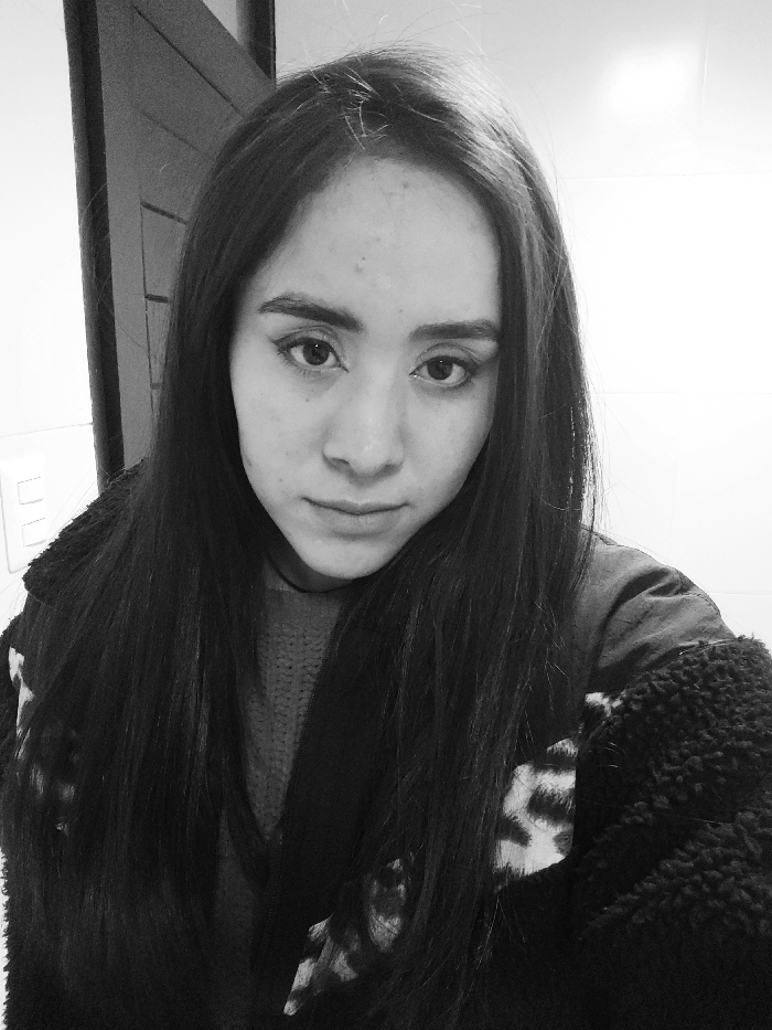 A black and white, chest-up portrait shows a young adult female facing forward, looking directly into the camera with a neutral expression
