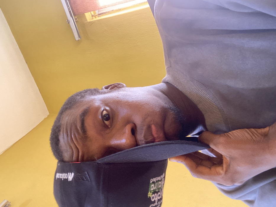 An individual is depicted indoors in Egan, Nigeria. A dark-skinned male with short dark hair, wearing a light grey crew-neck t-shirt, is positioned centrally. He holds a black baseball cap with a flat brim, partially obscuring the left side of his face. The cap displays white text, including "Crypto Naira" and "Empowering," on its front. His right eye is wide open, looking directly at the viewer, while his lips are puckered. His right hand is visible, holding the cap's brim. The background consists of a mustard yellow painted wall and a white ceiling. A window with a translucent brown curtain or blind is visible on the right, admitting sunlight, and a white fluorescent light fixture is mounted on the wall above it.