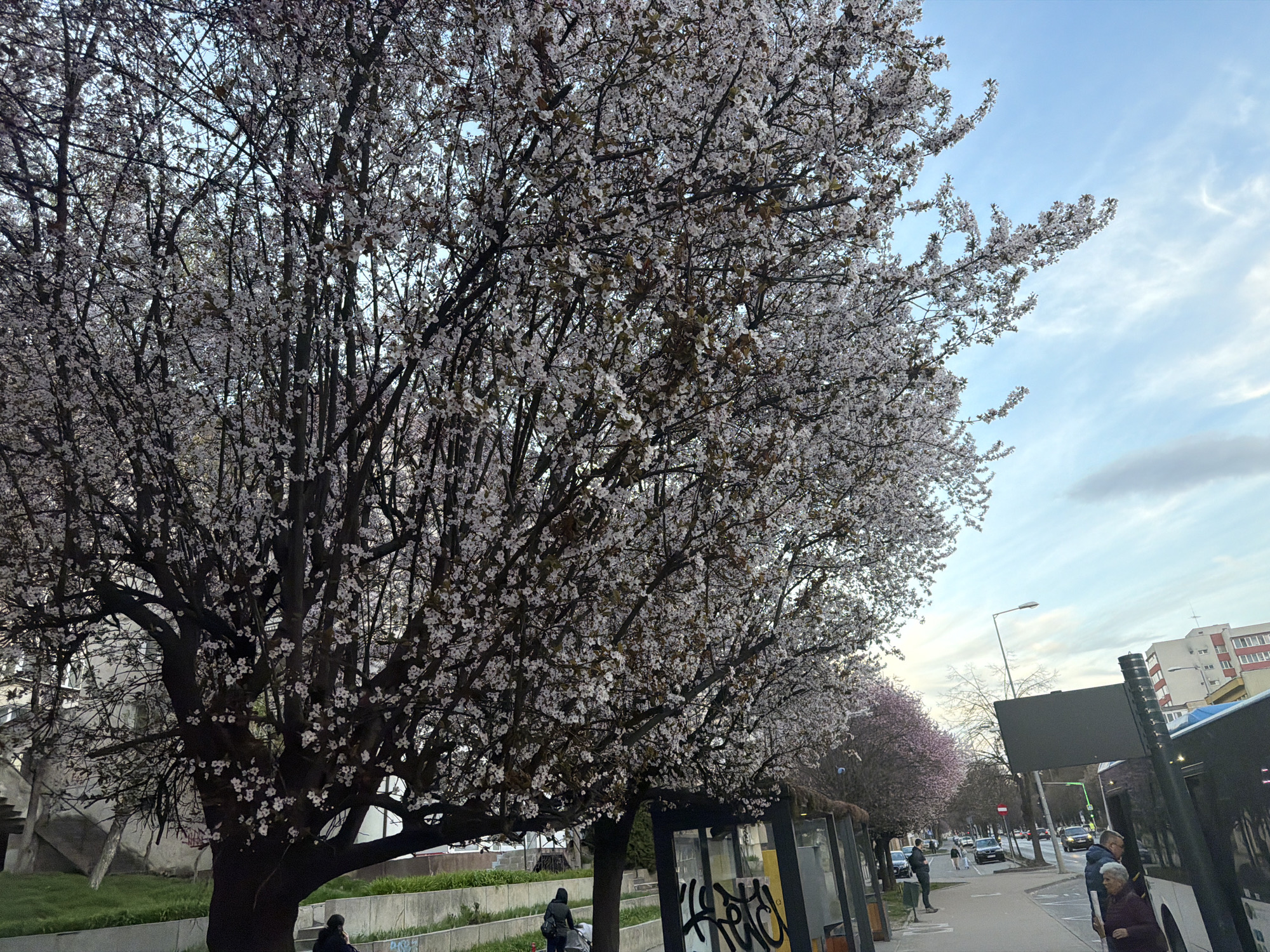 The image displays an outdoor street scene in Târgu Mureș, Romania, under a clear blue sky with sparse, wispy white clouds. The left and center foreground are dominated by a dense row of large deciduous trees in full bloom, bearing numerous small white flowers on dark, branching limbs. Behind these, additional trees with pink blossoms are visible further down the street. A paved sidewalk occupies the right side of the image, running parallel to an asphalt road with two visible lanes of traffic. Two bus stop shelters with black frames and transparent panels are positioned on the sidewalk; one shelter has prominent white graffiti on its lower panel. A tall streetlight pole extends upwards from the sidewalk-road divider. Several individuals are present: on the far right, an elderly woman with white hair, wearing a dark red jacket, stands next to a man in a blue jacket near a dark-colored bus partially visible on the street. Further left on the sidewalk, a person in a dark hooded jacket walks away from the viewer, pushing what appears to be a stroller or cart. Another person stands near a bus stop sign in the mid-ground. Multiple passenger vehicles are observed on the road, some appearing to be in motion, others stationary. In the background on the right, a multi-story building with alternating orange and white sections is visible. On the far left, behind the main trees, a concrete building with an external staircase is partially discernible. Grass strips and concrete barriers line parts of the sidewalk and green areas.