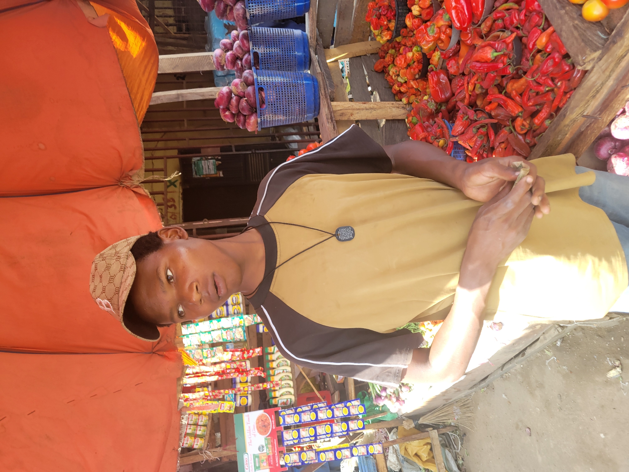A person wearing a brown and tan shirt and baseball cap is standing in front of a market stall. Baskets of red onions and peppers are displayed behind the person. Canned goods and spices are visible on the stall behind the person. The location is determined to be Madalla, Nigeria.