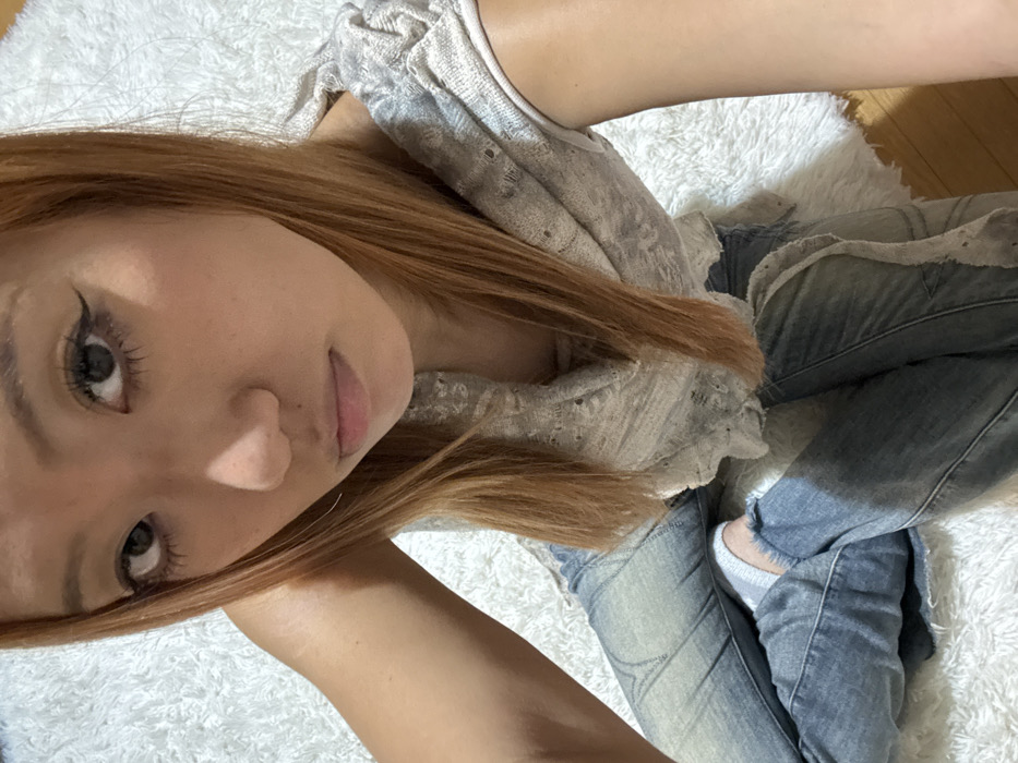 An East Asian female is depicted in an indoor setting, assumed to be in Minato, Japan. She is seated on a white, shaggy, high-pile rug, with a small section of a light brown wooden floor visible to the lower right. The individual, seen from an elevated perspective, has long, straight, reddish-brown hair parted centrally, dark eyes with prominent black winged eyeliner, dark eyebrows, and light pink lips in a neutral expression. She wears a light-colored, textured, open-weave short-sleeved top, possibly a knit or lace, featuring a draped or cowl neckline. Her lower body is clad in faded blue denim jeans with visible seams and distressed areas, particularly at the cuffs, revealing a light-colored ankle sock on her left foot. The subject is looking directly into the camera, maintaining a neutral to serious gaze. The lighting is consistent with ambient indoor illumination.