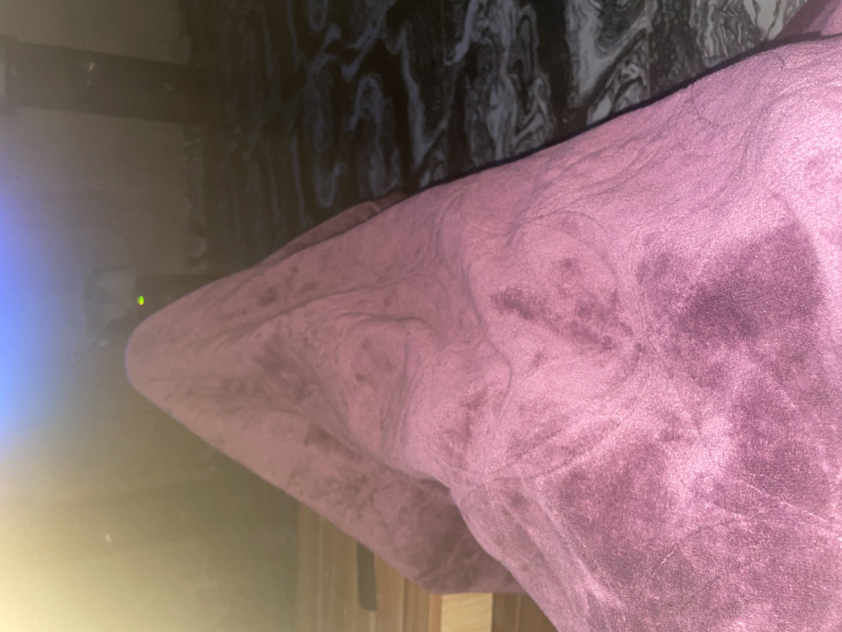 A close-up shot features a plush, mauve-colored material draped over a surface