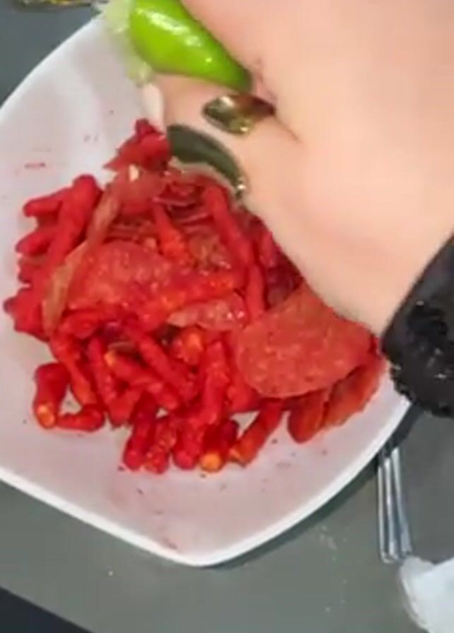 person squeezing a lime over a bowl of red, processed snacks. The snacks appear to be a mixture of Flamin' Hot Cheetos and possibly some type of red tortilla chips. The person's hand is visible, adorned with a gold-colored ring, and their nails are painted with a neutral color. The bowl is white and square-shaped, sitting on a gray surface. A spoon or fork is partially visible to the right of the bowl. In the background, there's a wrapped item, seemingly a gift, adding context to the environment.
