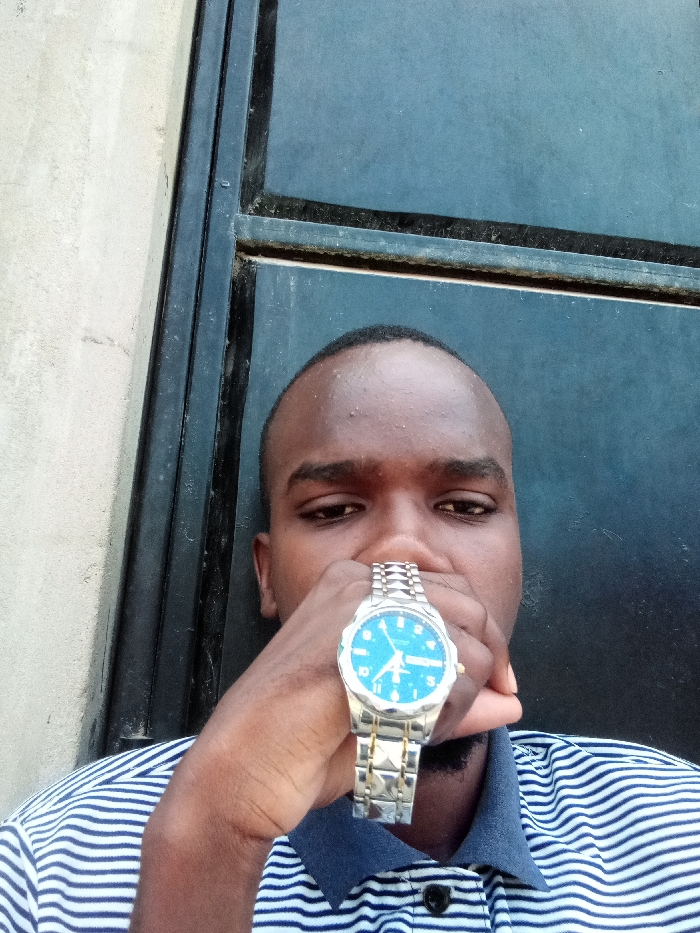 A male individual with dark skin and short dark hair is depicted from the chest up, facing the camera directly. He wears a striped polo shirt with horizontal white and dark blue bands and a solid dark blue collar with two visible black buttons. His left hand is raised, holding a silver-colored metal wrist watch with a linked band. The watch features a bright blue face with white hour markers and three white hands, and minor gold-colored accents are visible on its case. The watch is positioned directly in front of the subject's mouth and lower nose, obscuring these facial features. The background to the left consists of a light-colored, textured wall. To the right and behind the individual, a dark-colored, multi-paneled structure, resembling a metal door or window frame, is visible. The scene is located in Mtopanga ward, Kenya.