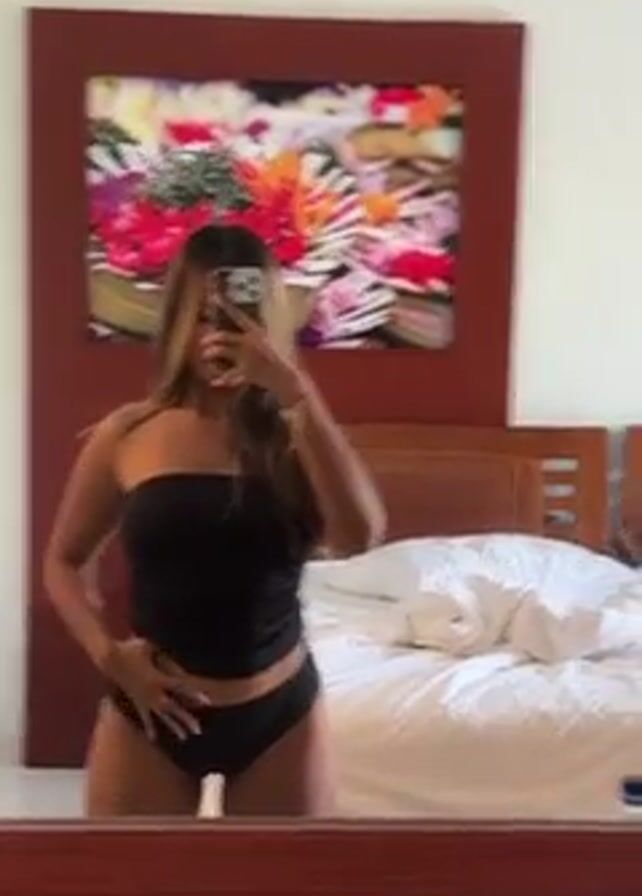 A woman stands in front of a mirror, taking a selfie with her phone. She wears a black strapless top and matching black underwear. Her hair is long, brown, and highlighted. She twists the top at her midsection and poses. Behind her is a bed with white linens and a wooden headboard. On the wall above the headboard hangs a framed picture with vibrant colors. The room appears to be a hotel room.