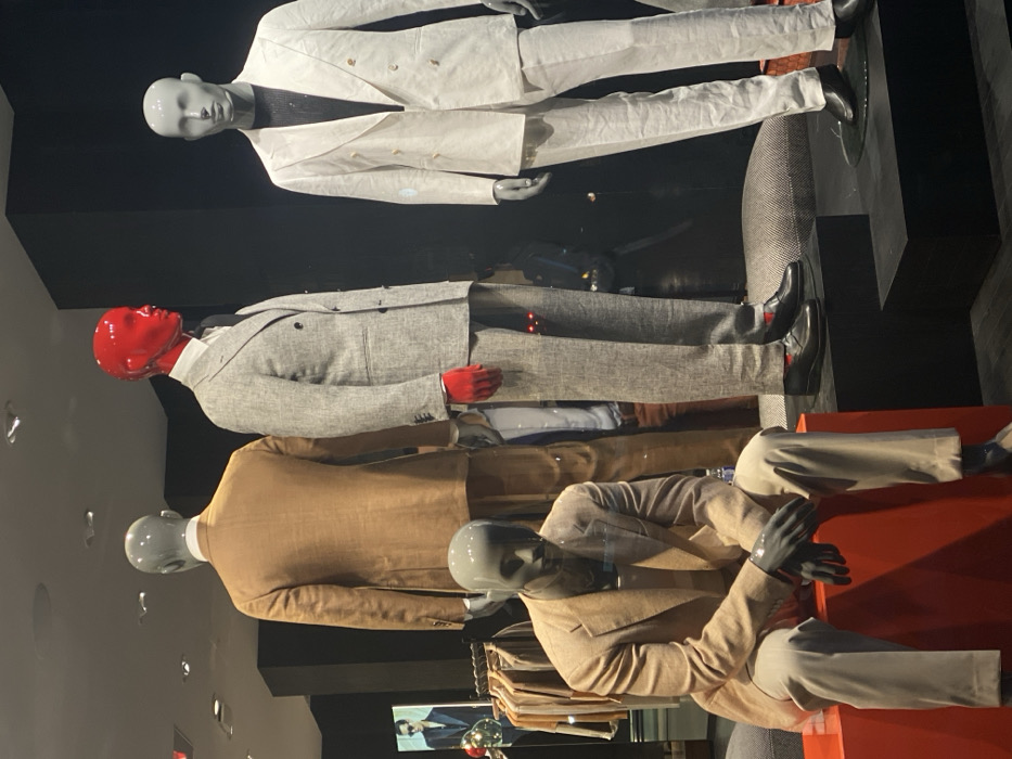 Three mannequins dressed in suits are stacked vertically. The top mannequin wears a white suit with a dark undershirt. The middle one is in a grey suit with red gloves and head. The bottom mannequin is in a tan suit with light beige pants and black gloves. The background is dark with visible reflections, appearing to be a shop window display.
